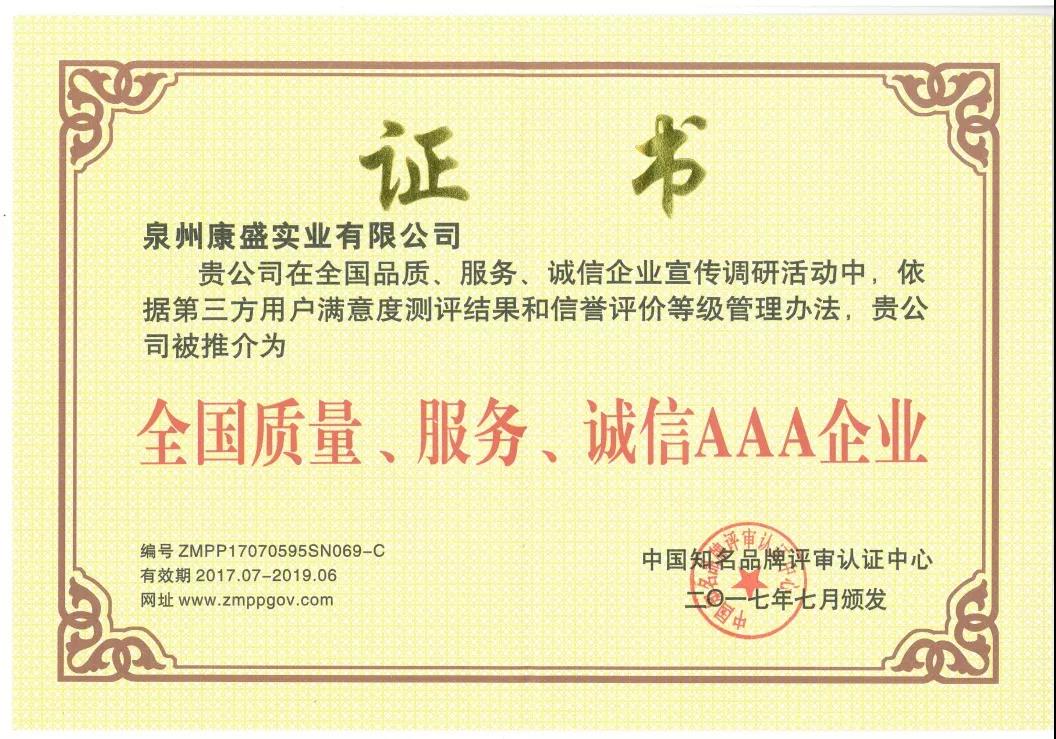 中國知名品牌評審認證中心推薦為“全國質(zhì)量、服務、誠信AAA企業(yè)”